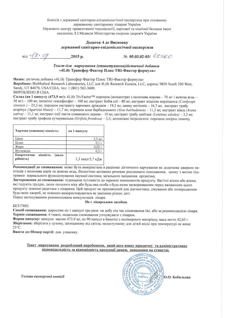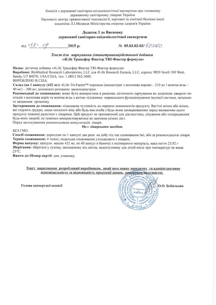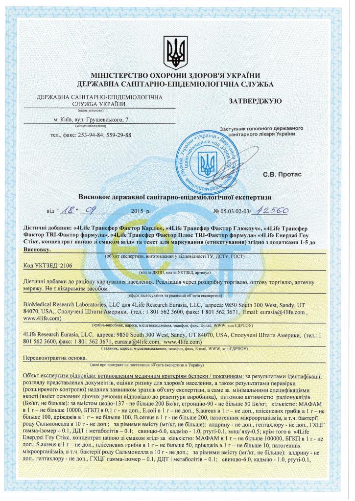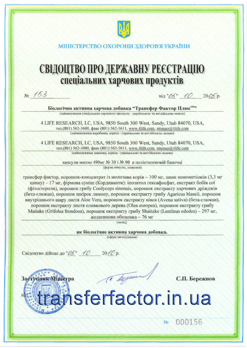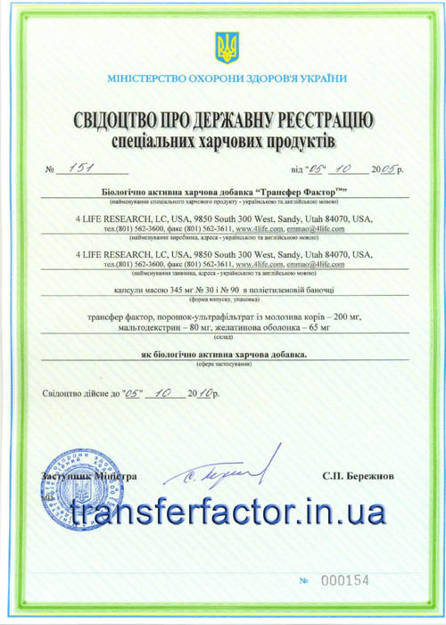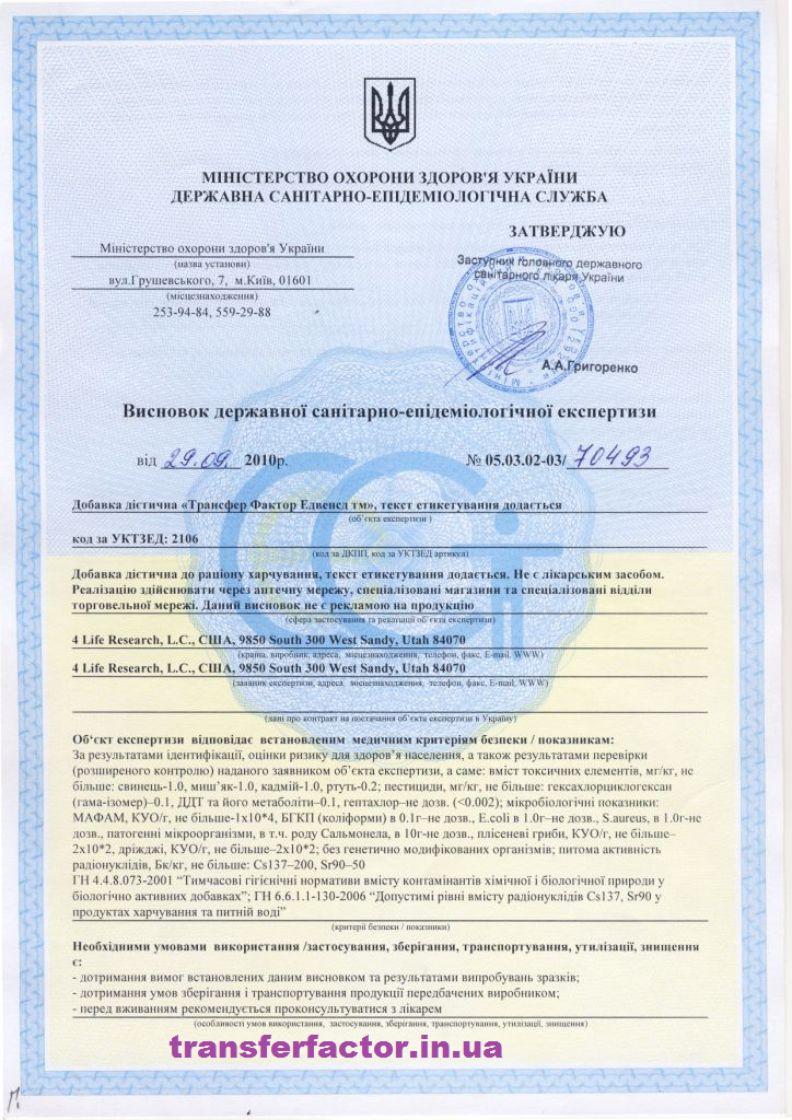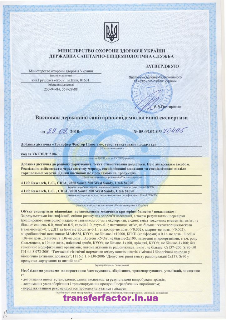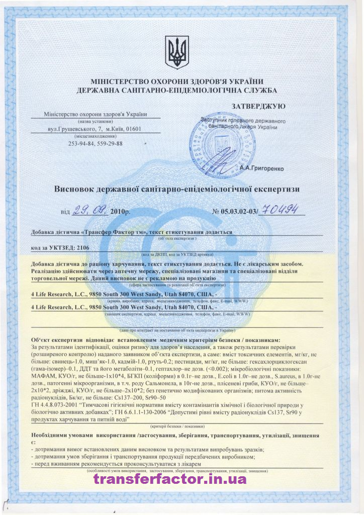 Трансфер Фактори мають всі необхідні документи для розповсюдження на території України, а також багато інших міжнародних сертифікатів та свідоцтв, які підтверджують якість, ефективність та безпечність продукції 4Life Research.